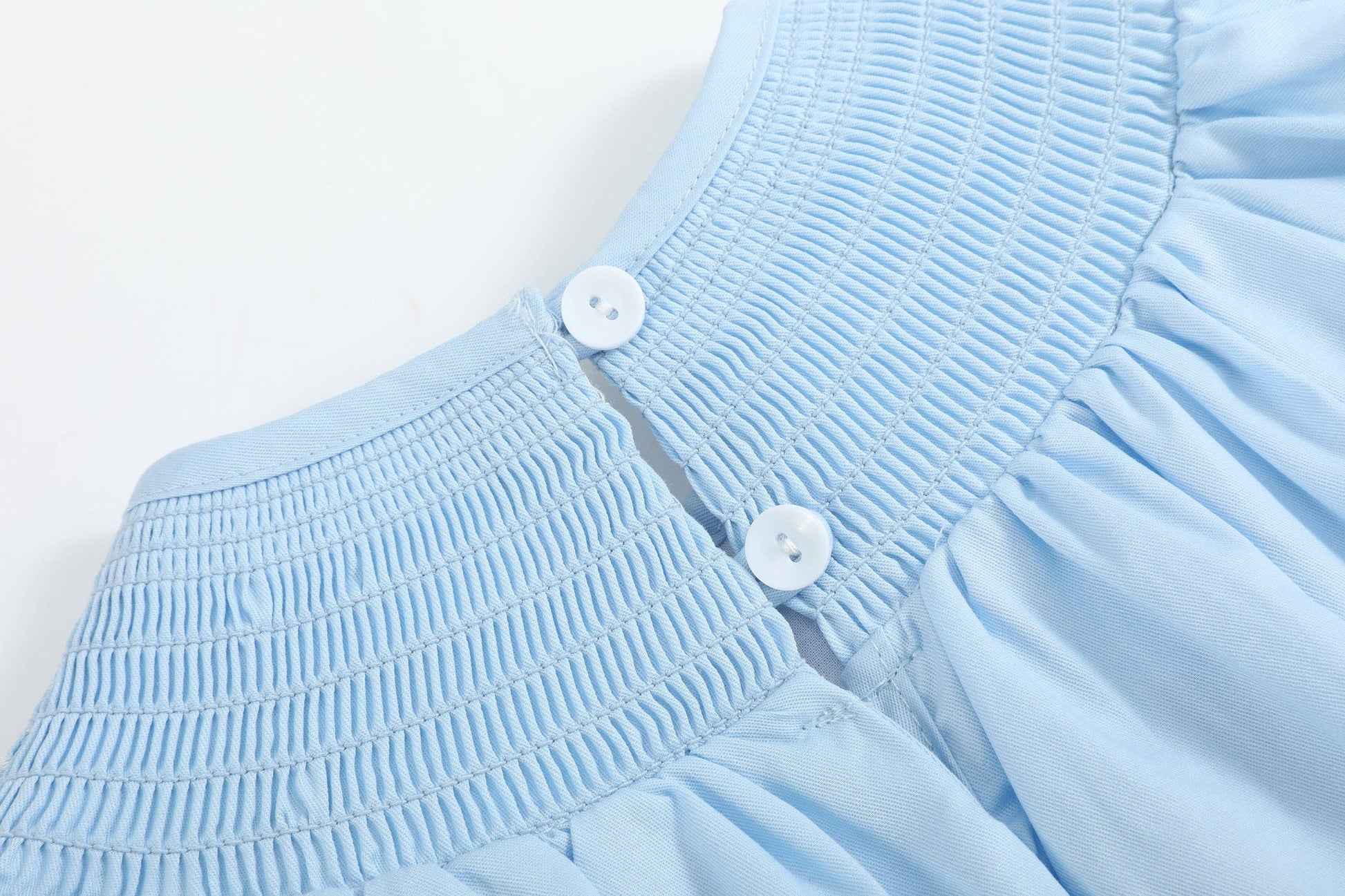 Classic and charming, this Blue and White Smocked Bubble Romper is perfect for your little one. Featuring beautiful smocking along the neckline, it adds a touch of timeless elegance to this adorable outfit. The soft blue fabric offers a fresh, fun look, while the bubble-style silhouette allows for easy movement and a cute, rounded fit. Snaps at the crotch make diaper changes quick and convenient, ensuring comfort all day long. Ideal for casual outings or special occasions, this romper is available in sizes 3–6M to 2T.