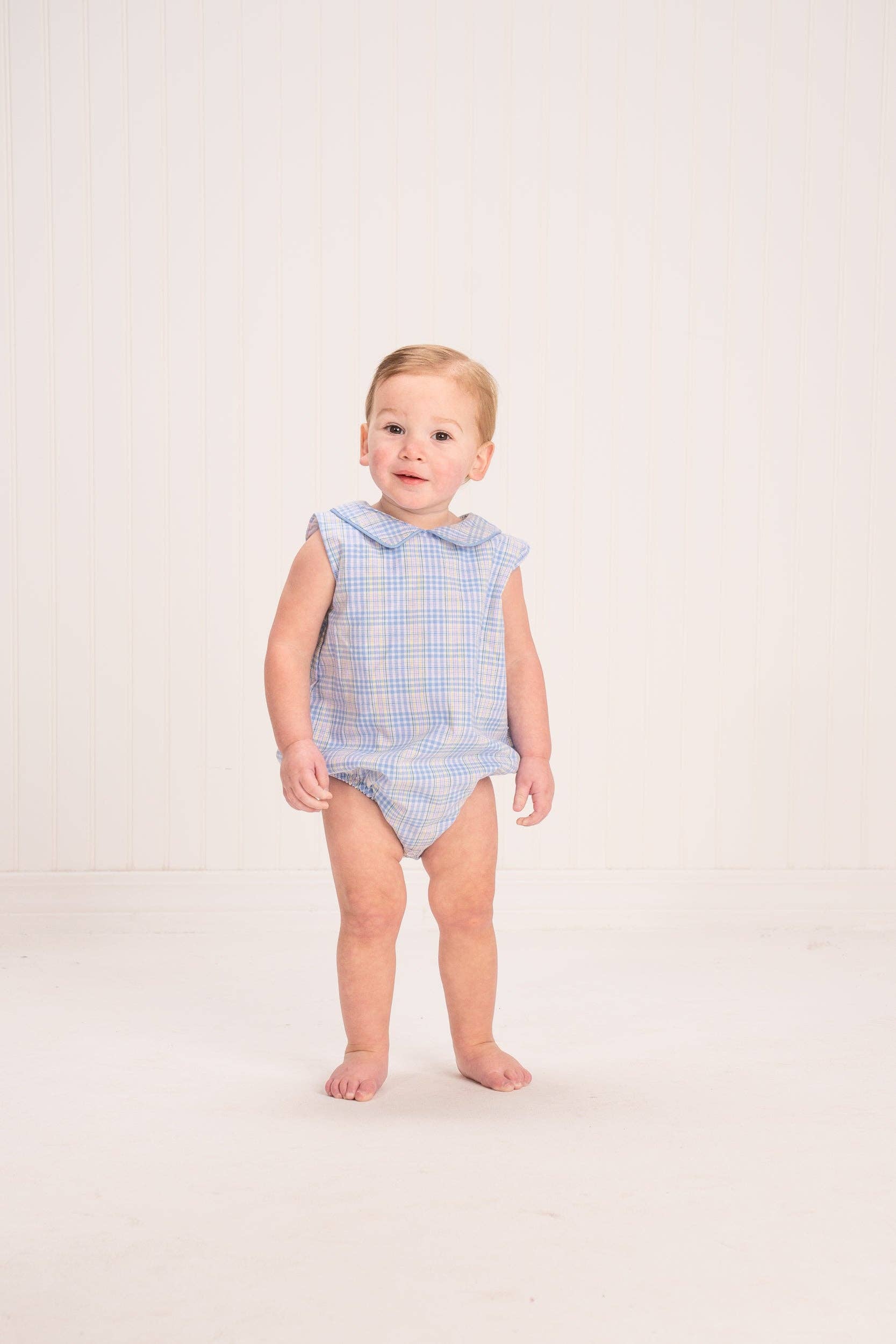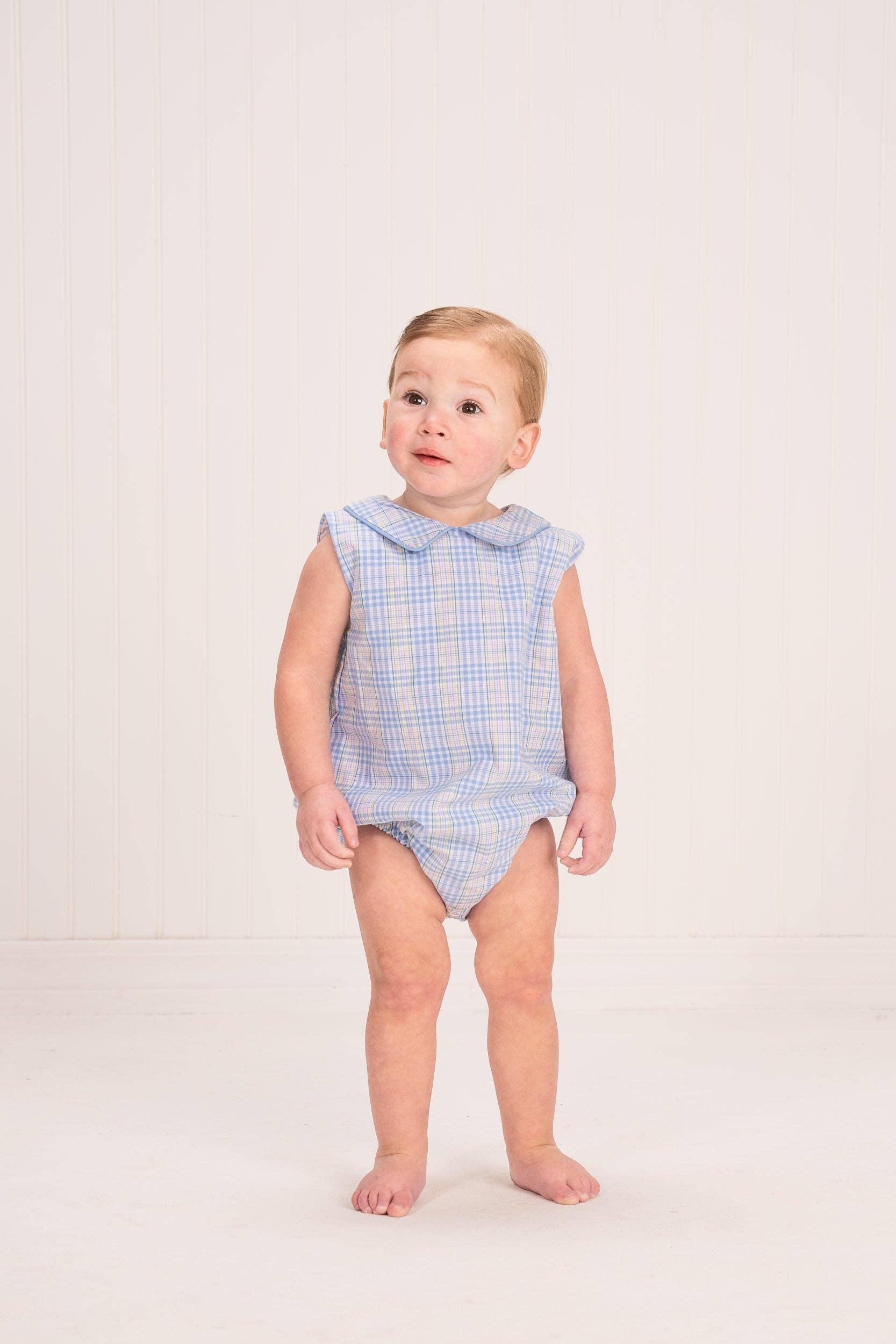Get ready for spring with the Camden Spring Plaid Bubble! This boys' bubble features a handsome piped collar and a playful spring plaid pattern. Perfect for any little one who loves to stand out in style. Add some fun to their wardrobe today!