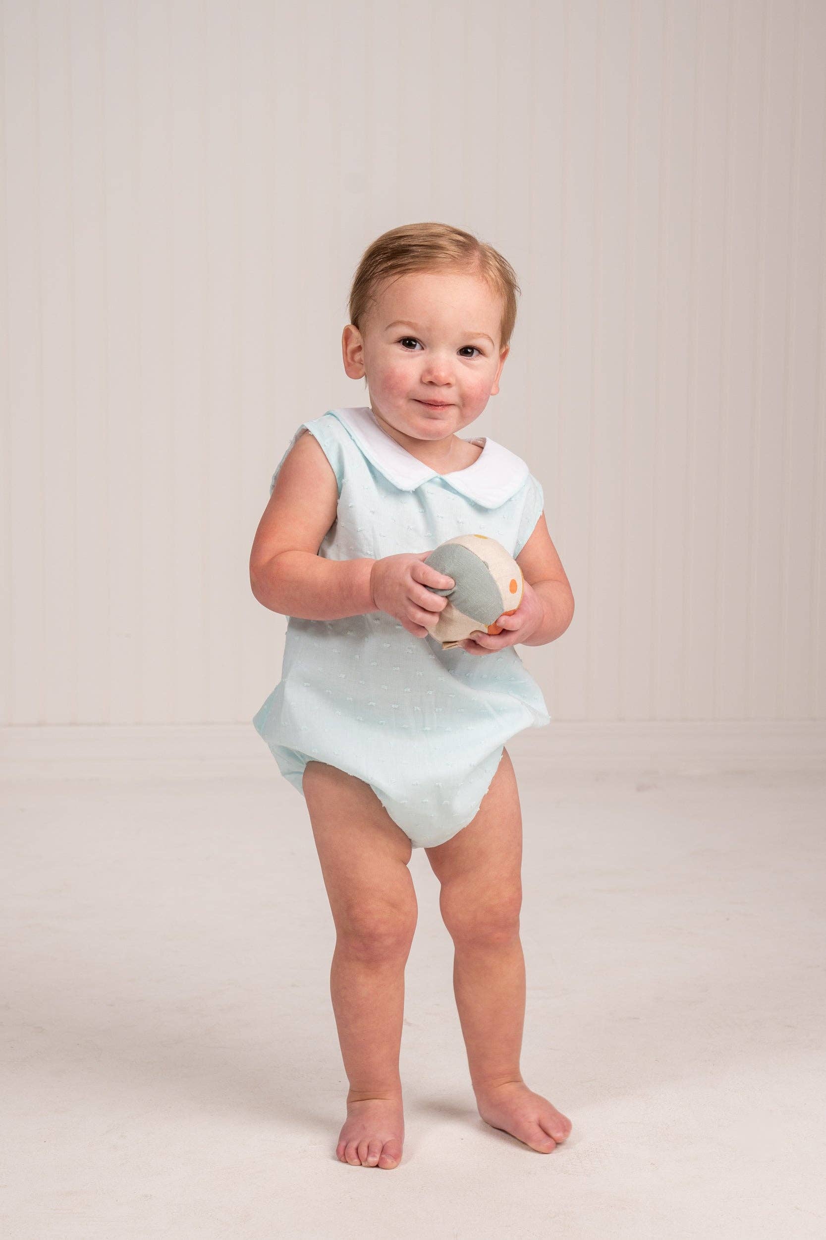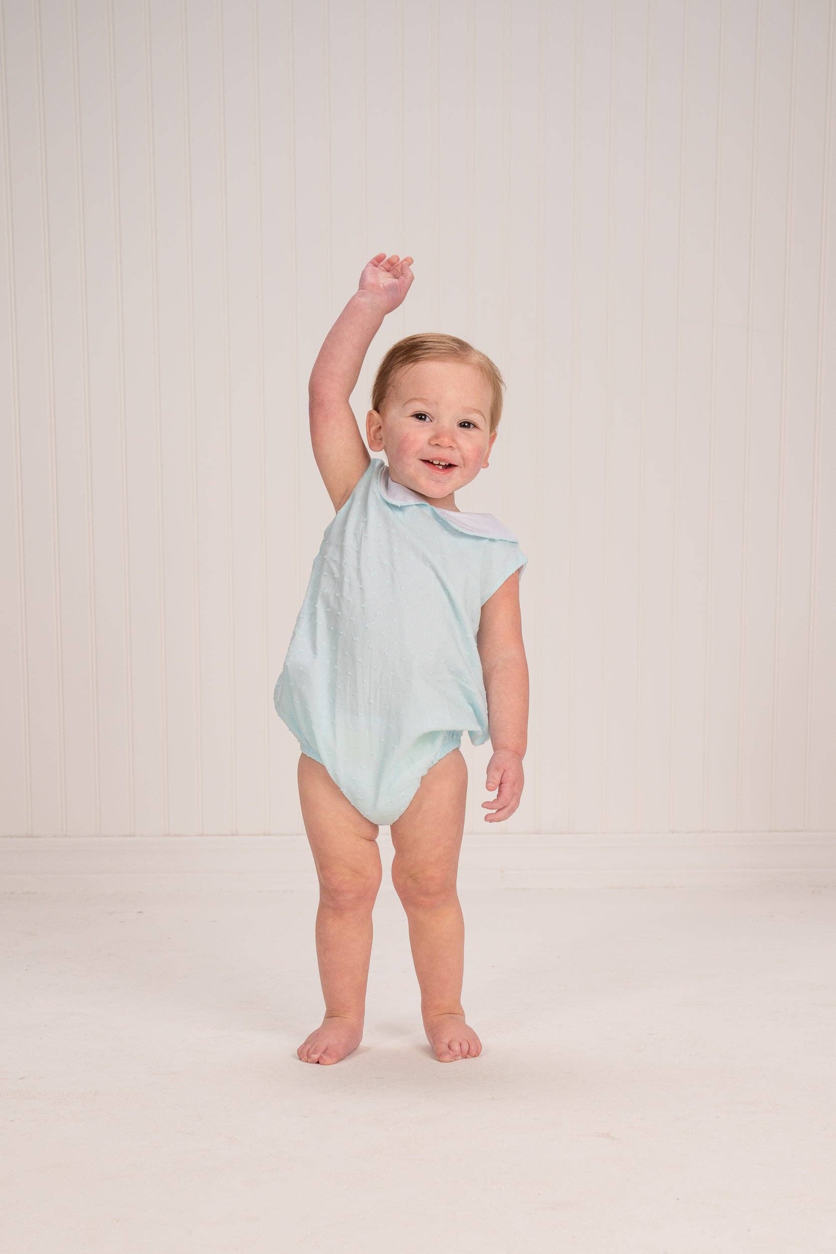 Our Jack Mint Swiss Dot boys bubble is a classic featuring a piped collar and lined body. The cut is true to size size up for more wear.